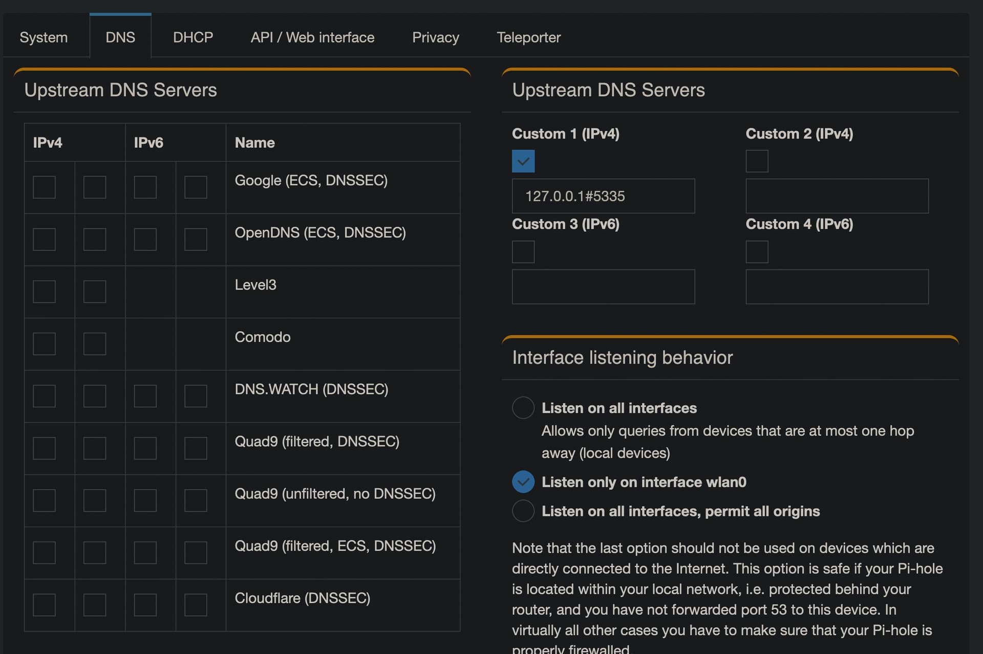 I attached a picture of my DNS settings in the Pi-hole web interface: