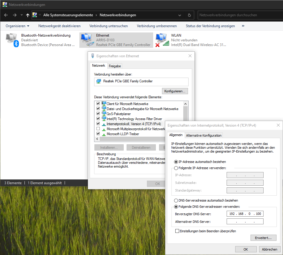 I receive the same output with my setup in my router where I set the DNS-Server to my pi (Picture 1) and when I try to directly set the server in my network adapter settings (Picture 2).
