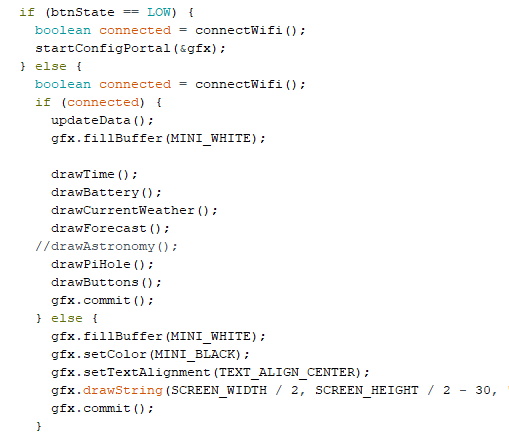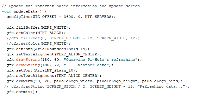 The code is simply adding the drawPiHole() function, referencing to it in the main program and finally commenting out the drawAstronomy() function from the original code. As both the ESP-32 from the original project and the ESP-8266 used here are similiar (both manufactured by Espressif, Arduino compatible & have integrated Wi-Fi)