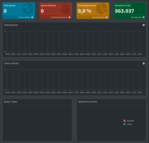 I have just installed Pi-hole with dockers in a fresh Raspberry 3 Raspbian box. Pi-hole seems to work ok but the dashboard shows no queries.