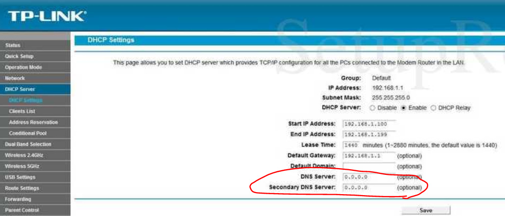 both the Technicolor and TP-link routers allow you to configure the DNS server(s) to be pushed via DHCP to the clients: