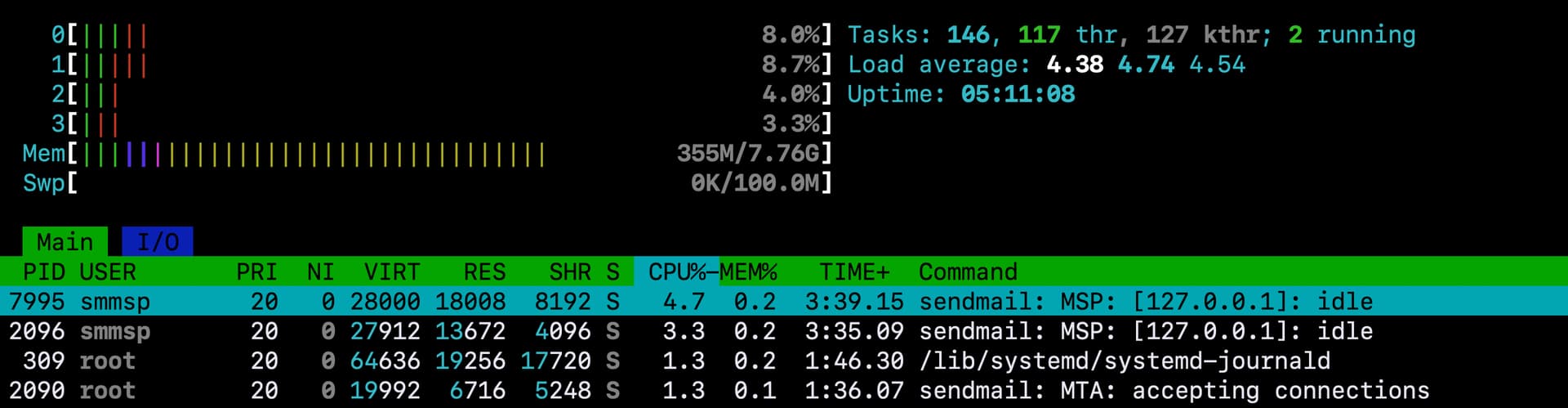 The strange thing is that htop doesn't show a high load at all. (see screenshot)