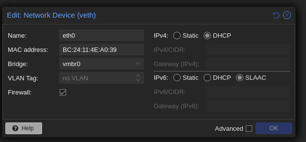 In proxmox, there is a setting to use SLAAC instead of DHCP, as per this post: