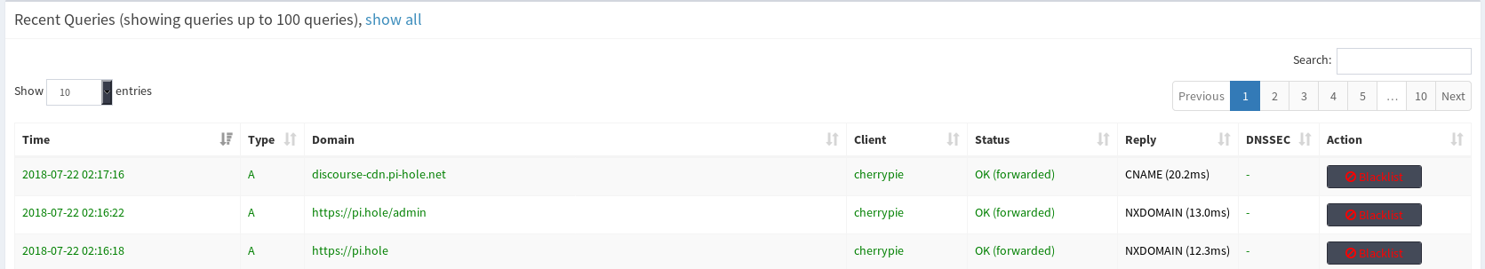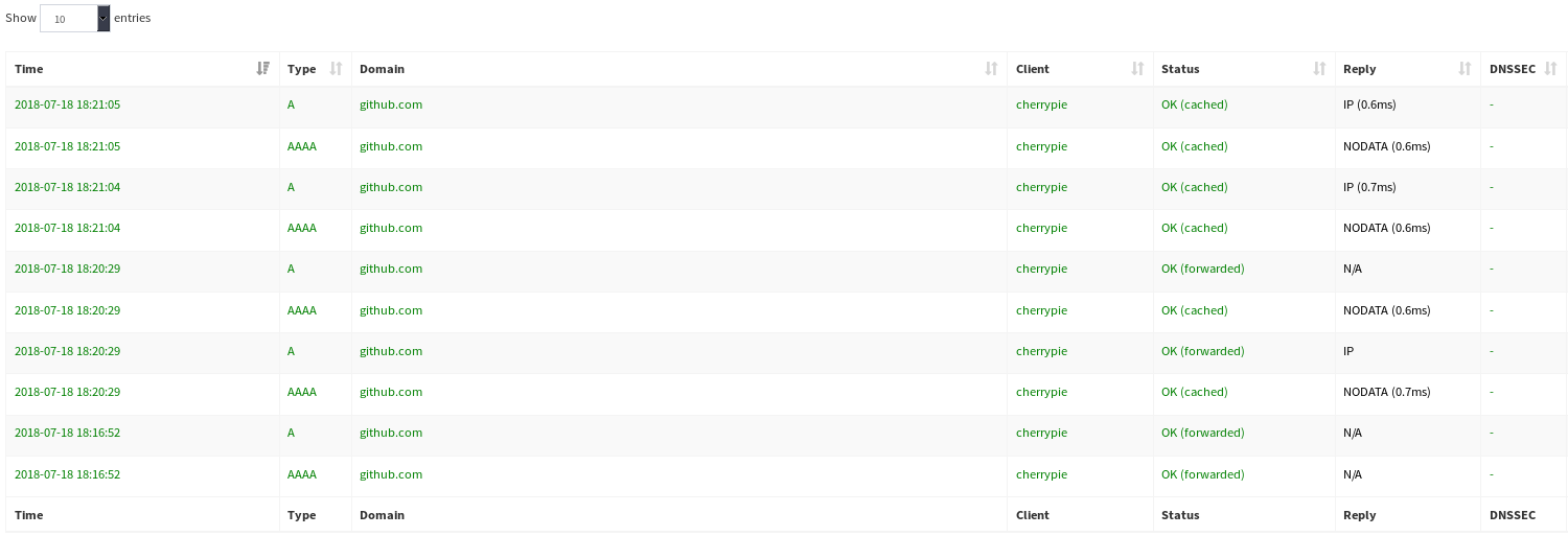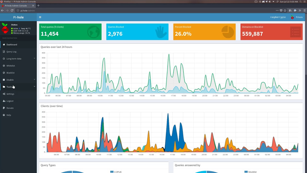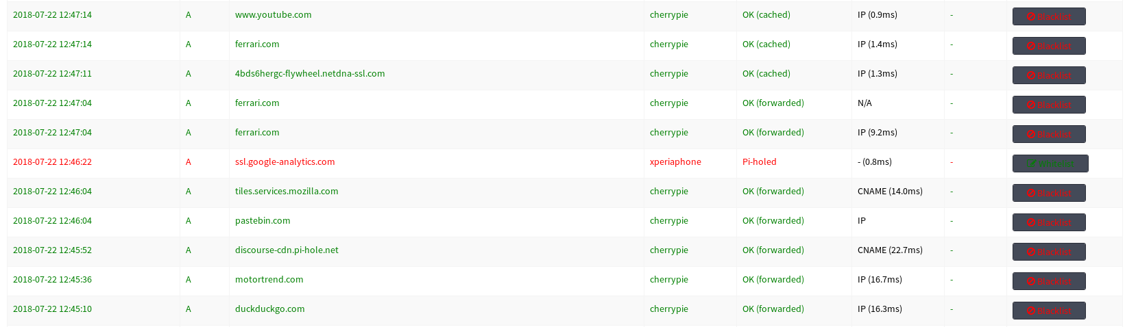 The Raspberry Pi is also under minimal load (PiHole is the only thing running on it, not even an X display server) and it's plugged in directly to my router with an Ethernet cable.