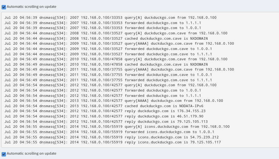 Jul 21 23:02:27 dnsmasq[29623]: 44673 192.168.0.135/63398 forwarded duckduckgo.com to 127.0.0.1
