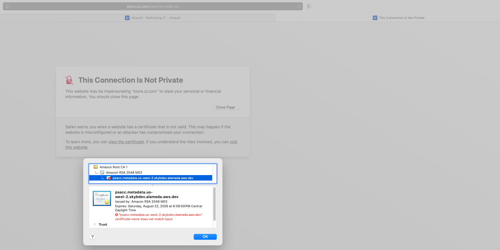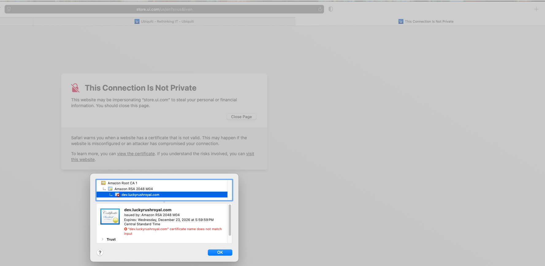 The weird part is that I can refresh the page and I will still get the invalid certificate. If I close browser, it doesn’t make a difference. If I connect to vpn, and the go to the site, it works fine with the certificate. From that point on, the site will function correctly. It “feels” like some type of caching issue.