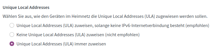 Heimnetz>Netzwerk> IP6 ULA aktiv, immer zuweisen, IPv6-Router im Heimnetz: Fritzbox stellt Standard zur Verfügung, DNS Server Router-Advertisement bekanntgeben und aktiv