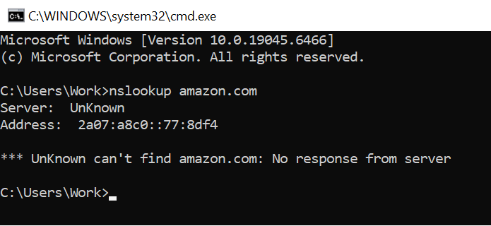 Went to test the setup via CMD line prompt - nslookup amazon.com and returns that it “can’t find amazon.com No response from server.”