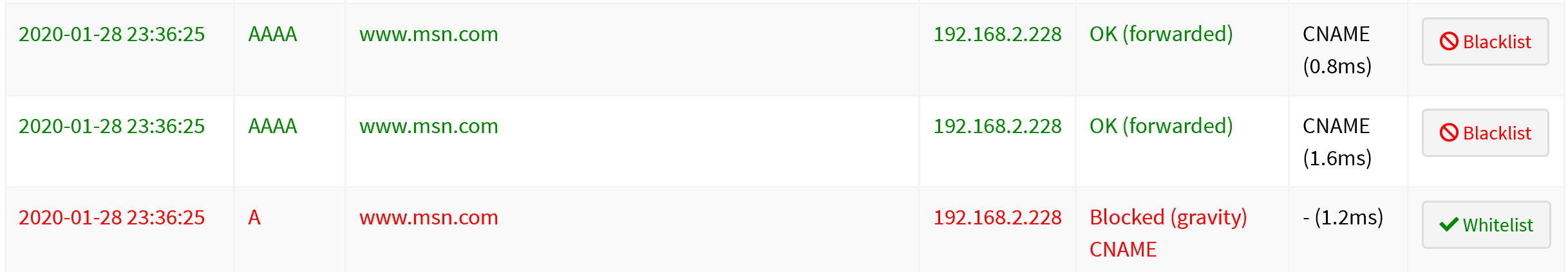 In my screenshot, www.msn.com is blocked (typeA). Is it possible the log shows the queries, pihole-FTL performs to determine www.msn.com is really a CNAME for gstatic.comwww.infinityhr.comwww.microsoft.comwww.msn.comwww.pages01.net, and never sends the the first 2 AAAA replies to the client?