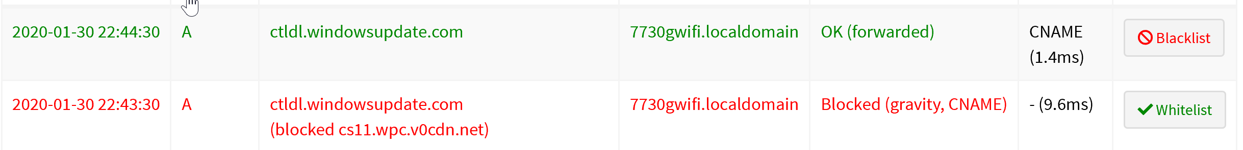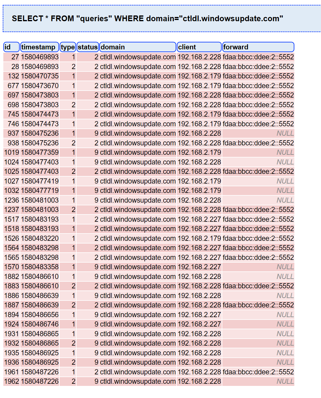 [2020-01-31 12:24:53.963 28875] **** new UDP query[A] "ctldl.windowsupdate.com" from 192.168.2.228 (ID 27, FTL 26, src/dnsmasq/forward.c:1571)