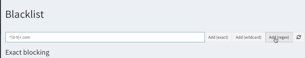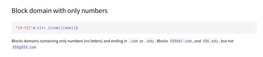 I am trying to add a regular expression to the blocklist that would block access to all domains that are just numeric. Like 1234567890.com or 1.com etc