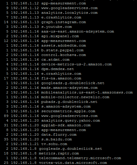 grep 192.168.2.250 /var/log/pihole.log.1 | grep gravity.list | sed 's/^.*]:/]:/' | sed 's/^[^:]*://g' | sort | uniq