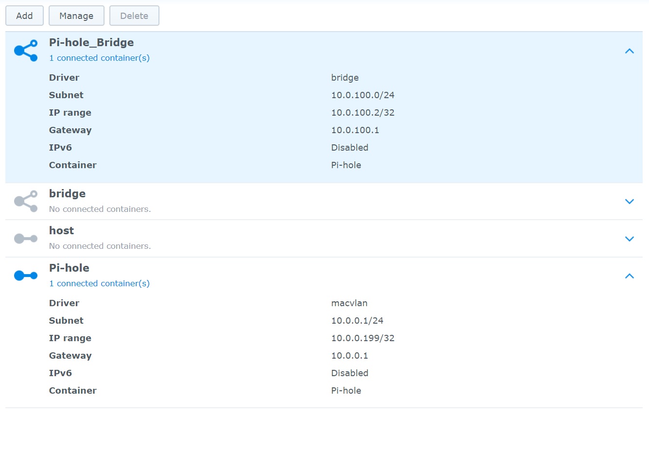 I setup like this to maintain pi.hole as the address for my pi-hole. Synology NAS will not give up port 80. The way I wrote it up it is almost like another computer on your network.