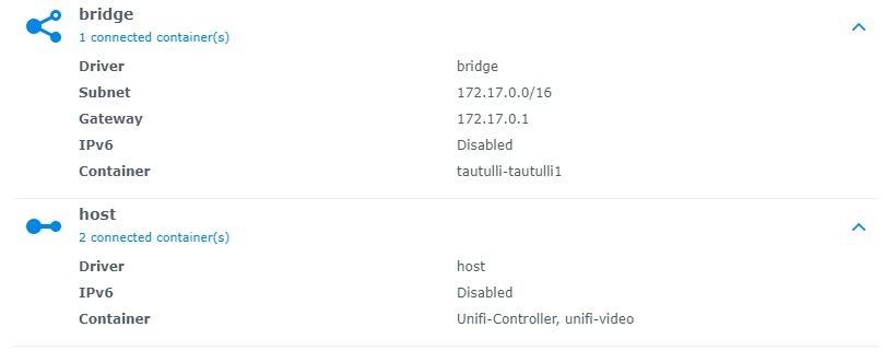 Have tried this a few times, with slightly different settings. Same error everytime it looks to be port related but there is no setup for ports in this. I am also running tatulli and a couple of unifi controllers, see other networks in docker, but don't think they should conflict? Other than that my syno is pretty standard.