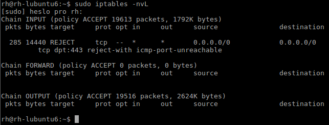 IP tables was without records. I add only one row about INPUT 443 port with REJECT.
