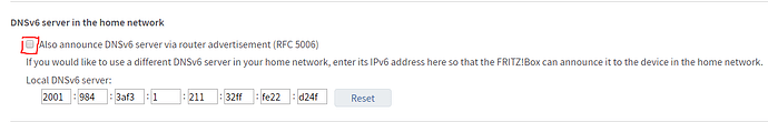 Back to the matter at hand, the android devices. I noticed they used IPv6 for queries when being served by pi-hole. So I looked into my fritz.box network settings for IPv6. I had added the IPv6 DNS address for the pi-hole there and checked the checkbox "Also announce DNSv6 server via router advertisement (RFC 5006)" checked.