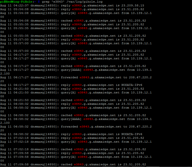 One other odd thing is, though, that your screenshot shows a domain e3843.g.akamaiedge.net which does not seem to exist in either of your uploaded files (pihole.log / pihole.log.1). It is possible that it was cut off during upload.