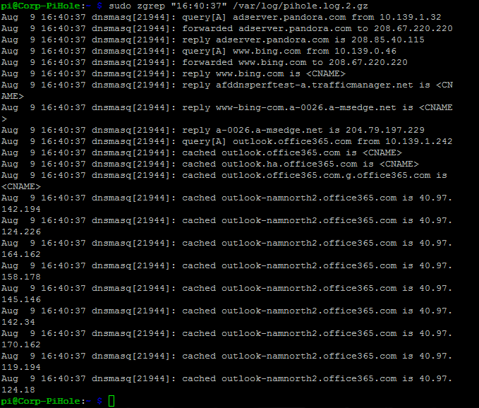 Back to the matter at hand... I tried to sudo cat /var/log/pihole.log.2.gz | grep "11:40" and got no results. I tried without grep: sudo cat /var/log/pihole.log.2.gz and the output was absolutely haywire. The bash went psycho and then ended up printing "PuTTyPuTTyPuTTy" over and over again in the prompt, so I closed out. Can you help me out with a command to handle this .gz file?