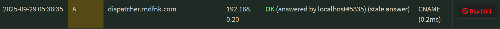Ok, stale answer wird also nicht ständig beim Aufruf der URL http://dispatcher.rndfnk.com/ im Browser angezeigt, sondern sporadisch bei der Anfrage der Domain dispatcher.rndfnk.com in der Antwort von Pi-holes Upstream geliefert und entsprechend im Query Log dargestellt.