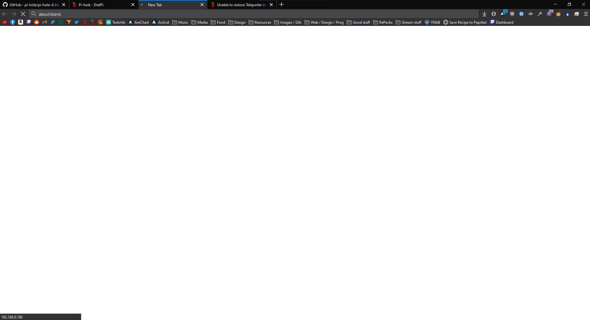 When restoring the Teleporter backup a new "about:blank" browser page opens and nothing happens. I am then unable to access the pihole admin portal and websites will be slow to load/sometimes unreachable.