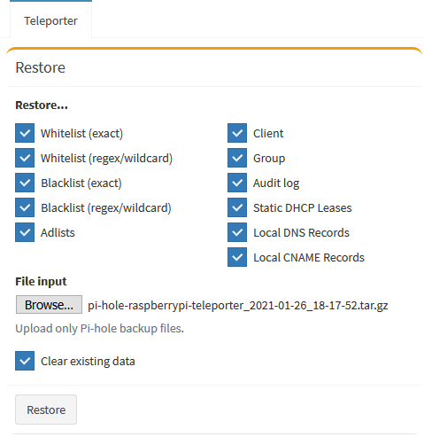 Restoring my teleporter backup in my new PiHole should reload my blacklists/whitelists/etc.