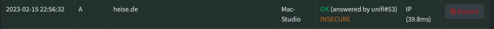 Dein Screenshot zeigt, dass Dein Pi-hole die Anfrage für heise.de erhalten, nicht geblockt und an unifi#53 weitergeleitet und mit der von dort erhaltenen IP-Adresse beantwortet hat.