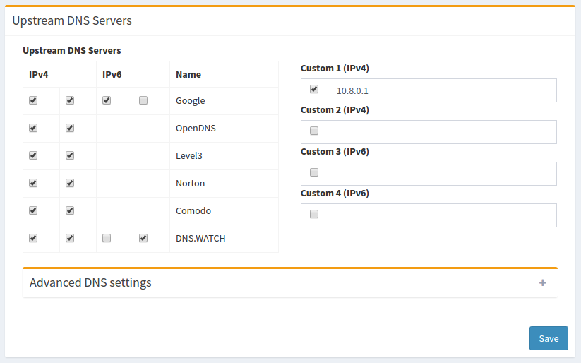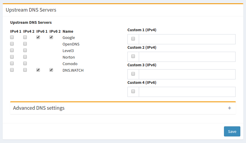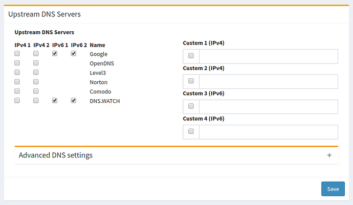 I re-open this Feature Request, because I don't think that the requester has been satisfied with the ability to manually specify two upstream servers. We should think of including IPv6 upstream servers which can be enabled by a click on the settings page (currently, all check boxes lead to IPv4 servers).