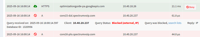 What does it mean when it says "Query Status: Blocked (external,IP)? The phones get their IPs the same way as everything else even though they are assigned by reservation. But that shouldn't matter. They work until PiHole is added as their DNS.
