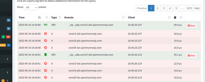 Pi-hole is not blocking the domains, then it will ask for the upstream server to answer "what is the IP of core15-dal.spectrumvoip.com?".
