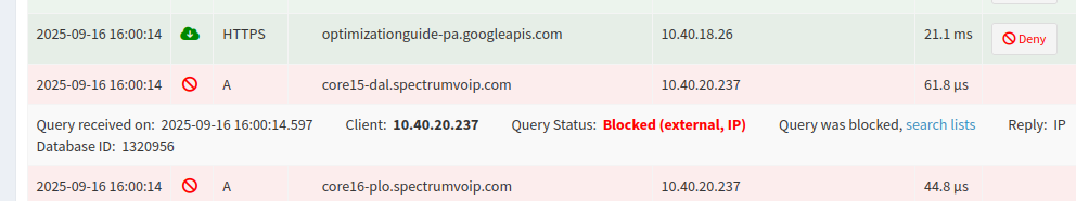 We have Spectrum VOIP phones in our network. I implemented a PiHole on out network and the phones stopped working. I looked through the list (the default suggested one from the install) and found no spectrumvoip.com listed in the block list, but when querying the blocked sites, it shows up with various subdomains.