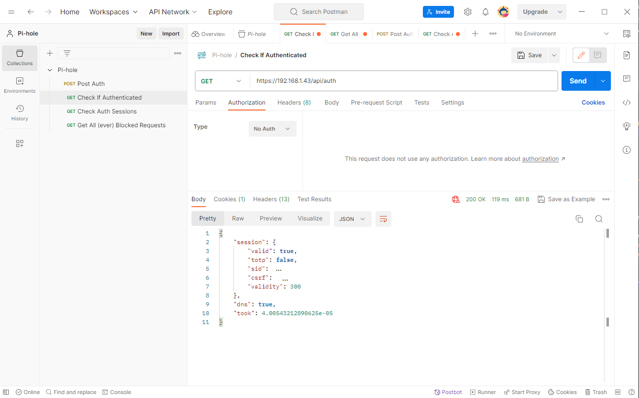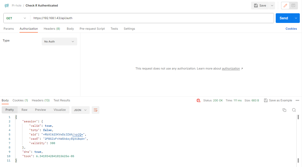 The GET for /api/auth/sessions requires a valid session. From your screenshots, it looks like your not sending your SID with the request and Pi-hole will reply with 401 as expected.