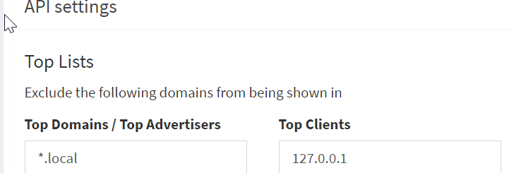 I've tried to ignore both *.local as well client 127.0.0.1 in setings->api/web interface and now the local domain no longer shows in the top domain list (nice), however those queries are still being accounted in the total queries...