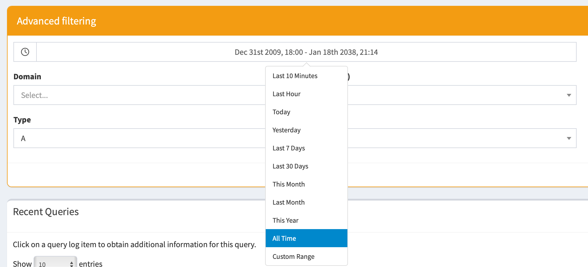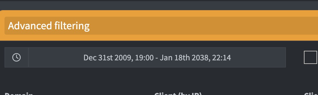 The default in the gold bar is "all time", and the date range shown will encompass all time on any Pi-hole installation. This "all time" will capture all your data, even though your data doesn't extend anywhere near the begin date and certainly won't extend forward past today.