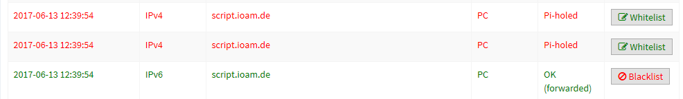 btw. the topic is something reverse, the question is: Why do blacklisted domains show IPv4 AND IPv6 as “Pi-holed” in the query log?