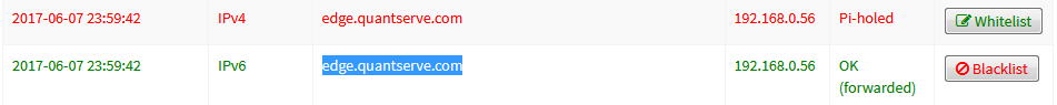 If you still see blacklisted IPv6 domains show as forwarded in your query log but don't have IPv6 enabled, you may see a false positive like the image below, where the IPv4 version of the domain is blocked, but not the IPv6 version.