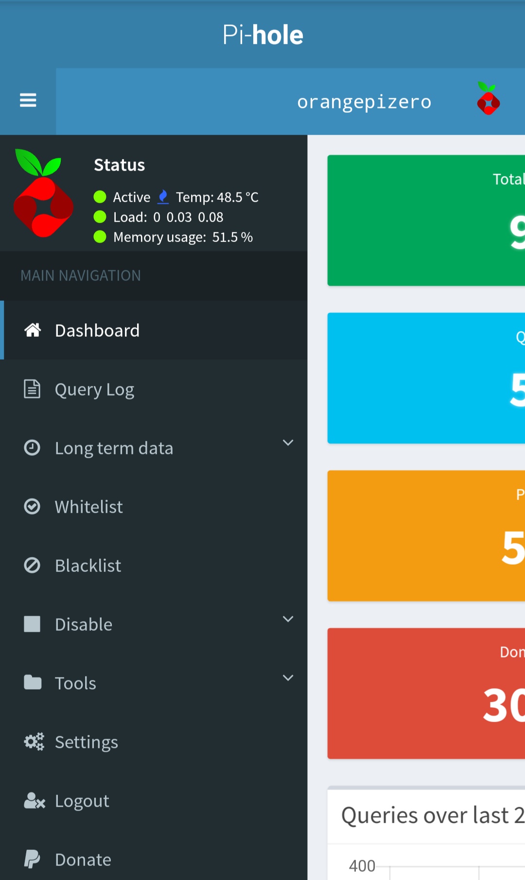 It isn't bad at doing the DNS filtering, no problems there. It does suffer slowdowns when you access via VNC or the web server for the dashboard and other simple pages. Looking at longer more complicated pages and queries slows the Pi B to a crawl or can render it unresponsive. CPU at 100% and it looks like the free memory is exhausted and the swap is getting full.