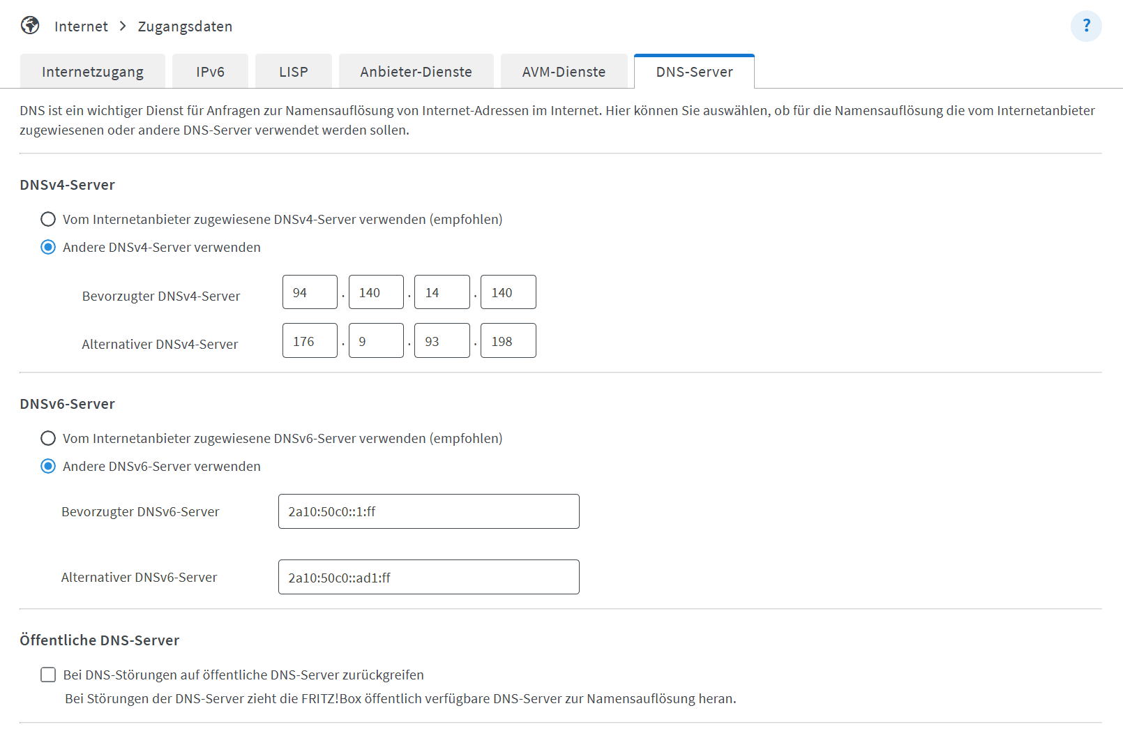 Die Einträge in der FRITZ!Box unter Internet | Zugangsdaten | DNS-Server sollten jetzt passen: